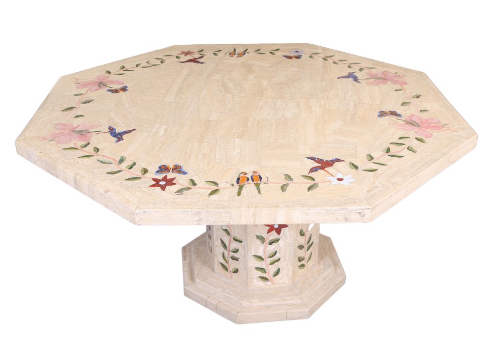 Mesa octogonal de 1,75m em mosaico de Travertino Romano e Onix Rosa. Acompanha base trabalhada com flores.
