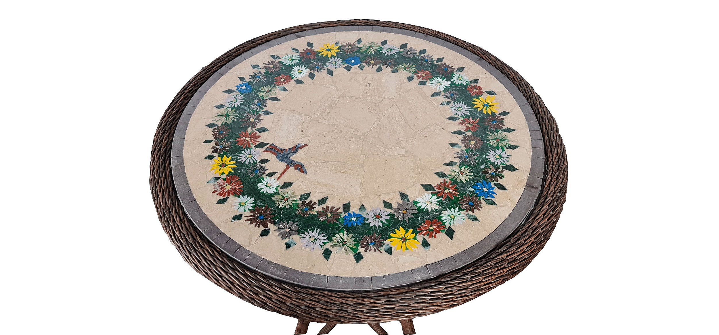 Tampo 060cm de diâmetro em mosaico de Travertino Romano com flores.